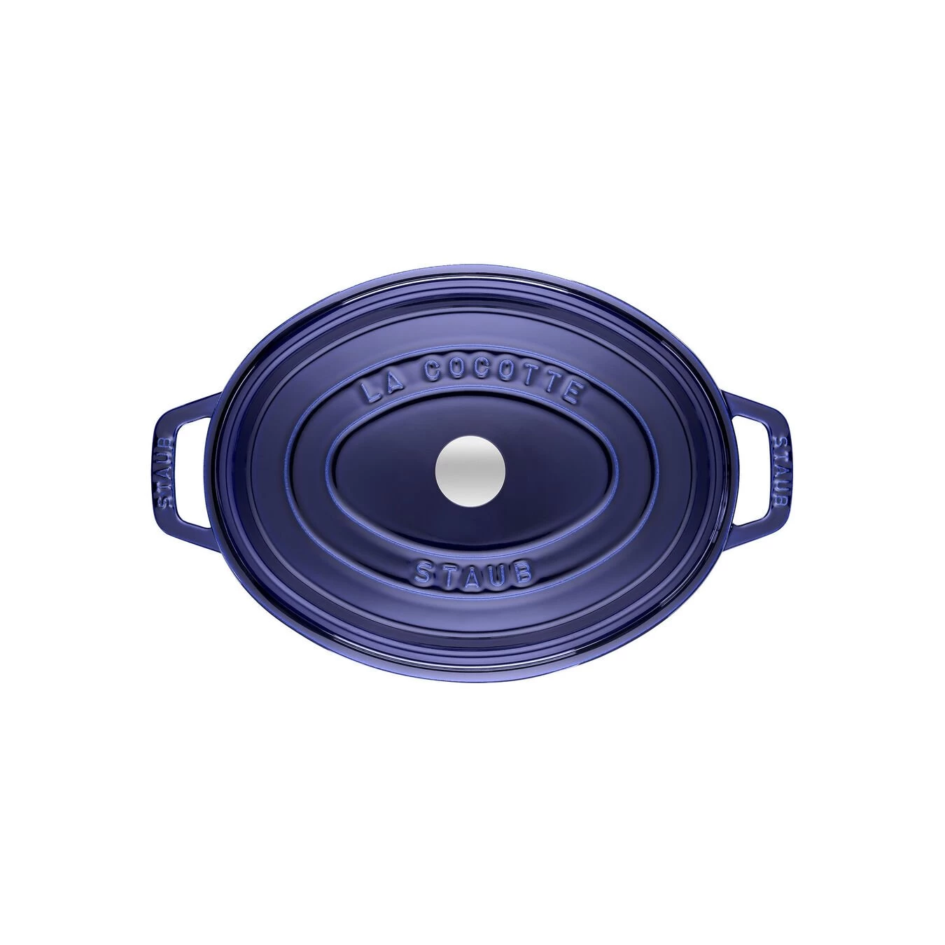 Cette cocotte ovale en fonte émaillée STAUB Bleu intense de 29 cm, est idéale pour 4 à 5 personnes, pour préparer des plats mijotés, des rôtis, de la volaille et même du pain ! Compatible tous feux et four, elle peut également s’utiliser sur induction. La couleur bleu intense de l’émail est obtenue avec la finition spéciale “Majolique”, une technique particulière appliquée à l’émail permet d’obtenir une brillance unique et une teinte d’une profonde intensité. Véritable savoir-faire authentique de création française, cette cocotte est une pièce unique, issue d’un processus de fabrication traditionnel. Avec son design élaboré et son poids optimisé, son couvercle plat au contour marqué présente d’excellentes propriétés de rétention de l’humidité et assure grâce à ses picots®, un arrosage homogène, une pluie d’arômes, pour des plats qui mijotent longtemps. L’intérieur de cette cocotte est émaillé noir mat, la marque de fabrique STAUB. Cet émail de qualité supérieure permet d’obtenir une meilleure résistance aux rayures et facilite l’entretien. Il possède les propriétés idéales pour saisir, rôtir et caraméliser les aliments. Née en Alsace, la cocotte STAUB a su traverser le temps et les frontières. Préférée aussi bien par les amateurs que les grands chefs, elle passe aisément de la cuisine à la table. Quel que soit le plat que vous concoctez, avec la Cocotte STAUB vous avez l’assurance de conserver toute l’intensité et les saveurs, la viande restera tendre et les légumes moelleux. Composée de fonte, un alliage de fer riche en carbone, un des matériaux qui retiennent le mieux la chaleur, la diffuse lentement et la redistribue de manière parfaitement homogène. Une fois la fonte suffisamment chaude, ses propriétés de rétention de la chaleur permettent de réduire le feu au minimum, afin de laisser mijoter doucement les plats. La fonte conserve également le froid : la cocotte à température ambiante peut être placée au réfrigérateur avant de servir afin de rester froide une fois à table.