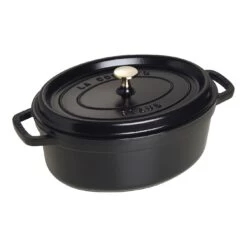 Cette cocotte ovale en fonte émaillée STAUB Noir mat de 29 cm, est idéale pour 4 à 5 personnes, pour préparer des plats mijotés, des rôtis, de la volaille et même du pain ! Compatible tous feux et four, elle peut également s’utiliser sur induction. Véritable savoir-faire authentique de création française, cette cocotte est une pièce unique, issue d’un processus de fabrication traditionnel. Avec son design élaboré et son poids optimisé, son couvercle plat au contour marqué présente d’excellentes propriétés de rétention de l’humidité et assure grâce à ses picots®, un arrosage homogène, une pluie d’arômes, pour des plats qui mijotent longtemps.L’intérieur de cette cocotte est émaillé noir mat, la marque de fabrique STAUB. Cet émail de qualité supérieure permet d’obtenir une meilleure résistance aux rayures et facilite l’entretien. Il possède les propriétés idéales pour saisir, rôtir et caraméliser les aliments.Née en Alsace, la cocotte STAUB a su traverser le temps et les frontières. Préférée aussi bien par les amateurs que les grands chefs, elle passe aisément de la cuisine à la table. Quel que soit le plat que vous concoctez, avec la Cocotte STAUB vous avez l’assurance de conserver toute l’intensité et les saveurs, la viande restera tendre et les légumes moelleux.Composée de fonte, un alliage de fer riche en carbone, un des matériaux qui retiennent le mieux la chaleur, la diffuse lentement et la redistribue de manière parfaitement homogène. Une fois la fonte suffisamment chaude, ses propriétés de rétention de la chaleur permettent de réduire le feu au minimum, afin de laisser mijoter doucement les plats. La fonte conserve également le froid : la cocotte à température ambiante peut être placée au réfrigérateur avant de servir afin de rester froide une fois à table.