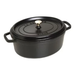 Cette cocotte ovale en fonte émaillée STAUB Noir mat de 31 cm, est idéale pour 5 à 6 personnes, pour préparer des plats mijotés, des rôtis, de la volaille et même du pain ! Compatible tous feux et four, elle peut également s’utiliser sur induction. Véritable savoir-faire authentique de création française, cette cocotte est une pièce unique, issue d’un processus de fabrication traditionnel. Avec son design élaboré et son poids optimisé, son couvercle plat au contour marqué présente d’excellentes propriétés de rétention de l’humidité et assure grâce à ses picots®, un arrosage homogène, une pluie d’arômes, pour des plats qui mijotent longtemps. L’intérieur de cette cocotte est émaillé noir mat, la marque de fabrique STAUB. Cet émail de qualité supérieure permet d’obtenir une meilleure résistance aux rayures et facilite l’entretien. Il possède les propriétés idéales pour saisir, rôtir et caraméliser les aliments. Née en Alsace, la cocotte STAUB a su traverser le temps et les frontières. Préférée aussi bien par les amateurs que les grands chefs, elle passe aisément de la cuisine à la table. Quel que soit le plat que vous concoctez, avec la Cocotte STAUB vous avez l’assurance de conserver toute l’intensité et les saveurs, la viande restera tendre et les légumes moelleux. Composée de fonte, un alliage de fer riche en carbone, un des matériaux qui retiennent le mieux la chaleur, la diffuse lentement et la redistribue de manière parfaitement homogène. Une fois la fonte suffisamment chaude, ses propriétés de rétention de la chaleur permettent de réduire le feu au minimum, afin de laisser mijoter doucement les plats. La fonte conserve également le froid : la cocotte à température ambiante peut être placée au réfrigérateur avant de servir afin de rester froide une fois à table.