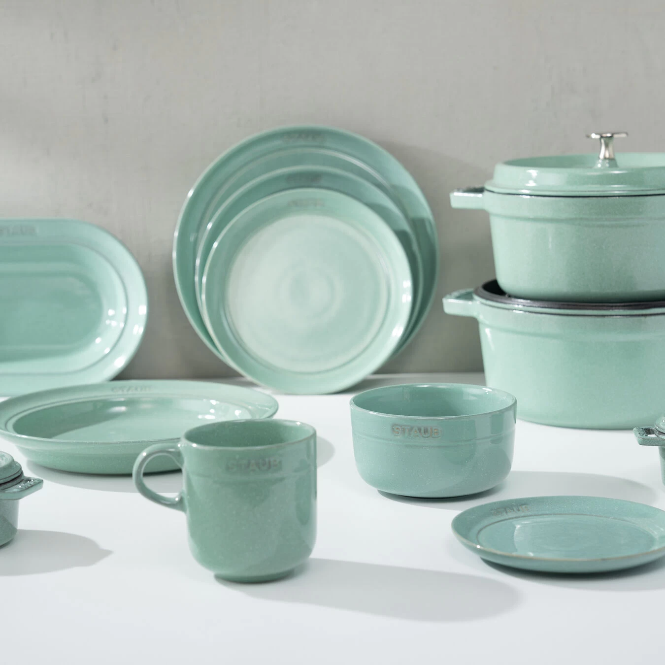 Accueillez comme il se doit vos invités avec une jolie table dressée avec de la vaisselle élégante et bien choisie. Non seulement cela mettra en valeur vos plats préparés avec amour, mais montrera à vos invités à quel point cela compte pour vous de les recevoir. La nouvelle couleur sauge permettra d’apporter un vent de fraîcheur sur la table. Le revêtement émaillé, avec son effet chatoyant unique, est la toile de fond parfaite pour les plats avec des herbes et des légumes frais – ou pour vous rappeler le printemps lors d’une froide soirée d’hiver.